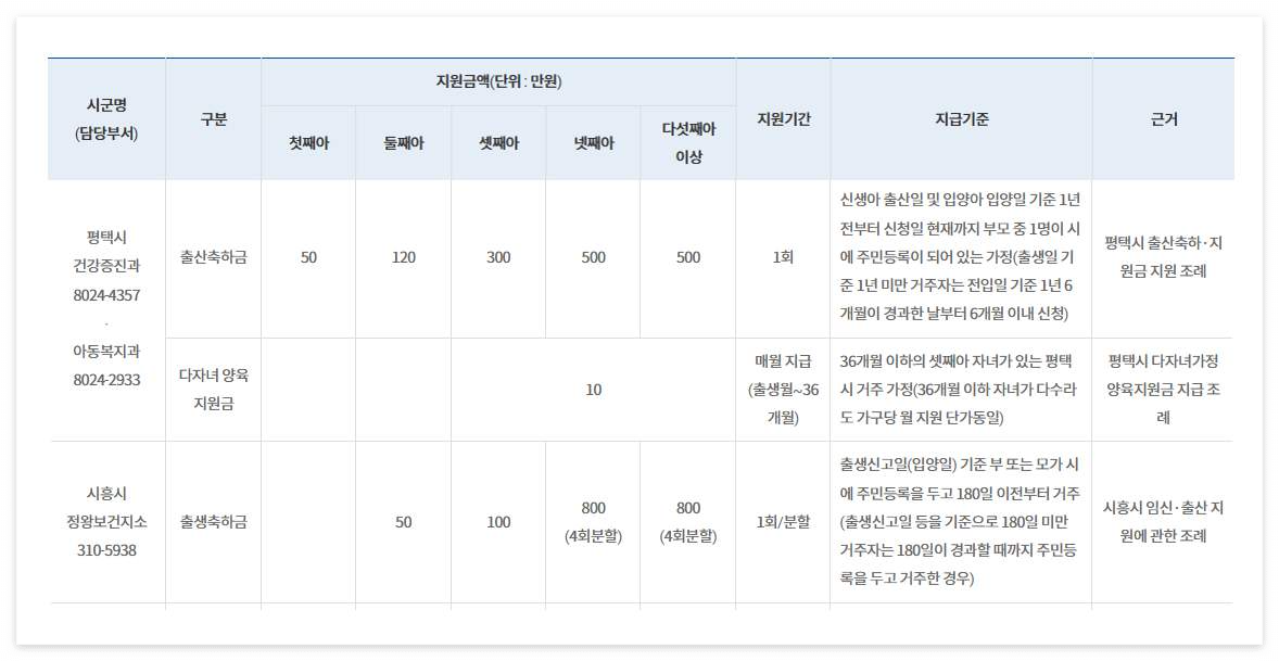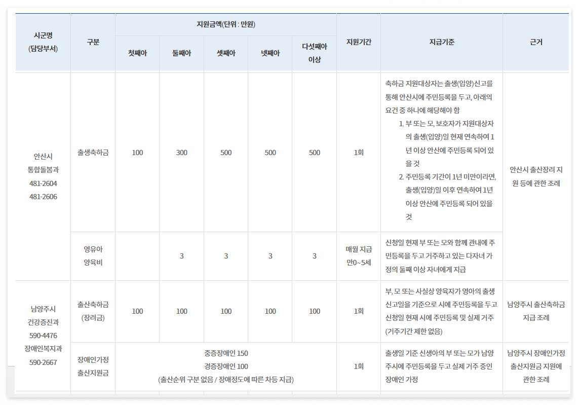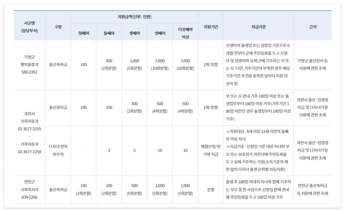 경기도 시군별 출산장려금 및 양육비 지원 현황 ('2025년 1월 1일 기준)
