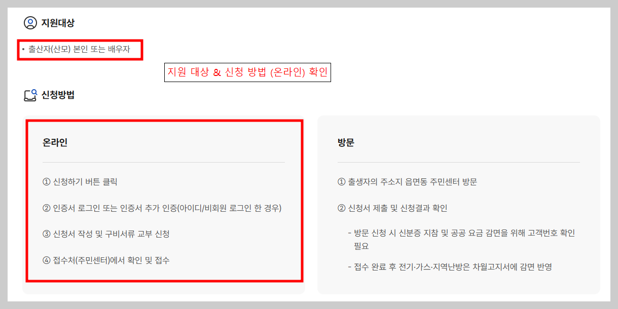 출산지원금은 온라인 또는 방문 신청이 2가지 모두 가능합니다.
