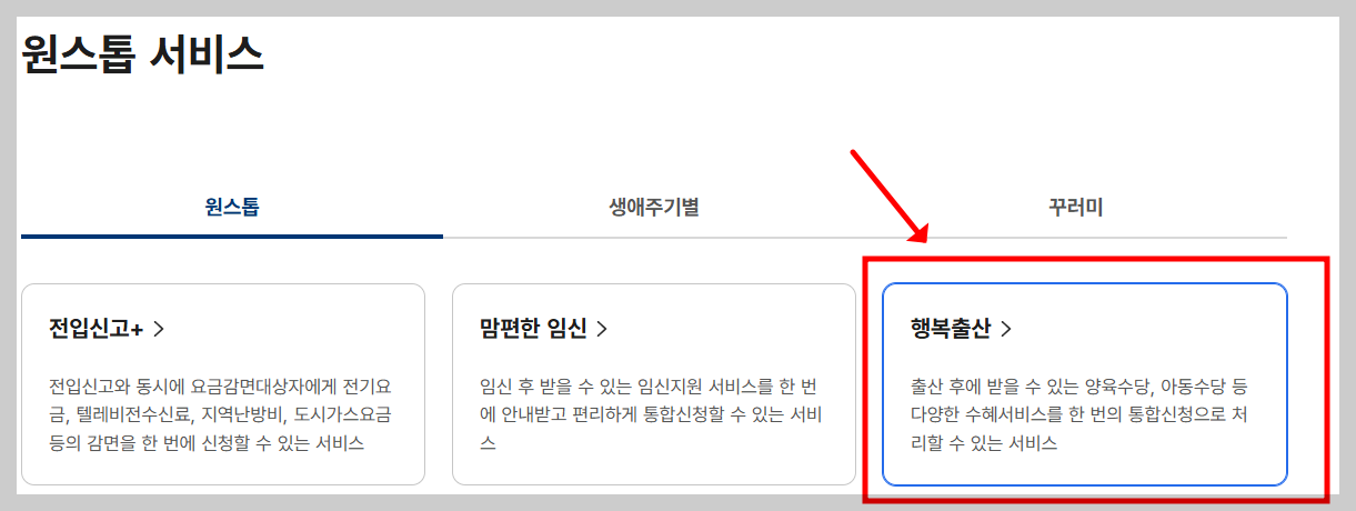 - 상단 메뉴에서 '원스톱 서비스'를 선택한 후, '행복출산'을 클릭합니다.