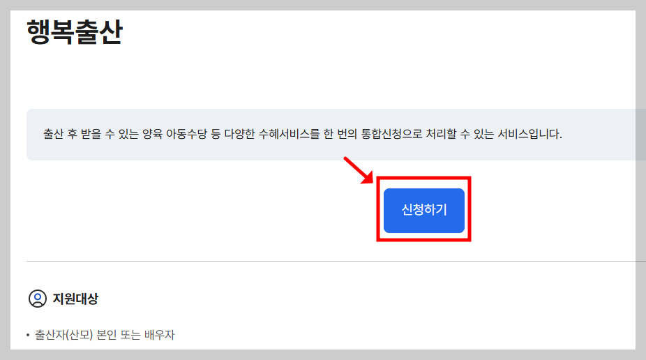- '출산 관련 서비스 통합처리 신청' 페이지에서 '신청하기' 버튼을 클릭합니다.