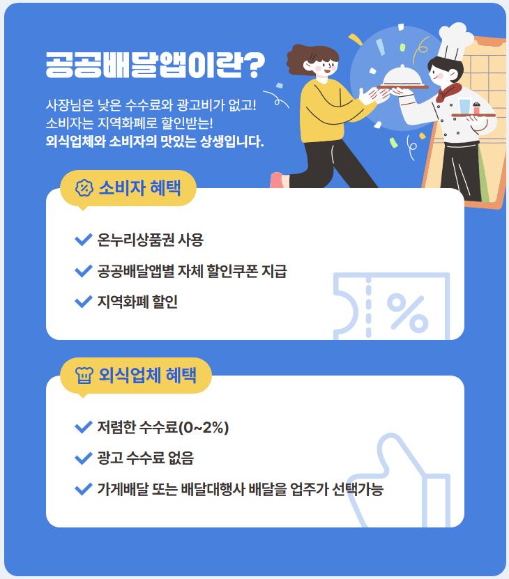 이번 1만원 할인쿠폰 정책은 전국 12개 공공배달앱에서 모두 사용할 수 있습니다. 각 앱은 지역 특화형으로 운영되고 있으며, 지자체와 연계돼 광고비나 중개수수료가 낮아 자영업자에게도 이득이고, 소비자에겐 실속 있는 가격으로 배달 음식을 즐길 수 있는 장점이 있습니다.