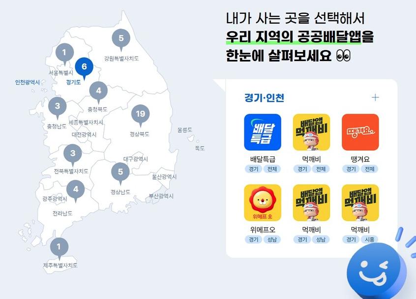 지방자치단체별로 이용할 수 있는 공공 앱은 한국농수산식품유통공사의 ‘공공배달’ 통합 홈페이지 에서 조회가 가능합니다. 아래 사이트를 통해서 앱을 조회하고 필요시에 앱 다운로드 (안드로이드, 애플) 링크를 이용해서 설치 및 사용 하시길 바랍니다.
