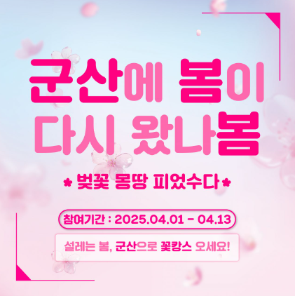 군산시는 벚꽃 명소를 배경으로 '군산에 봄이 다시 왔나봄' 인증샷 이벤트를 진행합니다. 참여를 원하는 분들은 4월 13일까지 군산의 벚꽃 명소를 방문하여 벚꽃 사진이나 벚꽃을 배경으로 한 인물 사진을 촬영한 후, 본인의 SNS 계정에 필수 해시태그(#군산벚꽃 #군산에봄이다시왔나봄 #촬영위치)를 포함하여 게시하면 됩니다. 응모된 사진은 군산시의 홍보 이미지로 활용될 수 있으며, 참여자 중 100명을 무작위로 추첨하여 1만 원 상당의 모바일 상품권을 지급할 예정입니다.