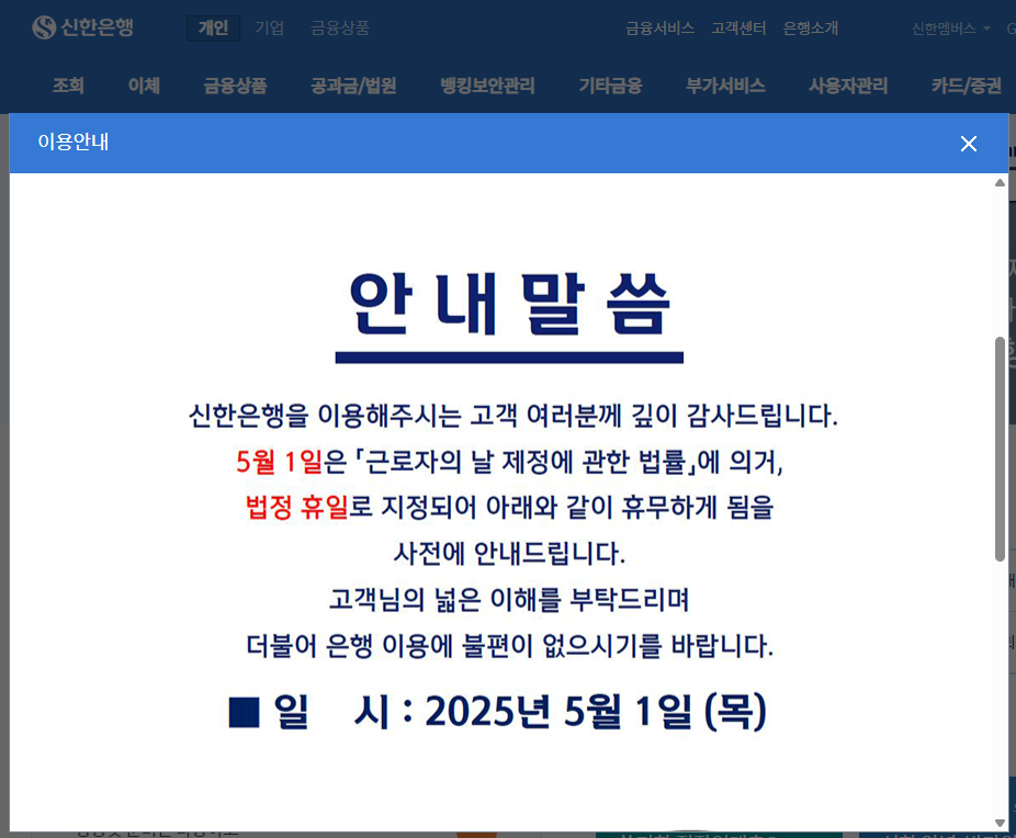 은행 직원들도 근로자에 해당하기 때문에, 5월 1일은 유급휴일로 영업을 하지 않습니다. 신한은행, KB국민은행, 하나은행, 농협, 우리은행 등 주요 은행 모두 문을 닫습니다. 콜센터 상담 서비스도 운영되지 않습니다. 휴일과 똑같은 상황인 거죠. 당연히 ATM과 모바일뱅킹은 정상 운영되지만, 근로자의날 당일 은행 창구 업무는 이용할 수 없으니 급한 은행 업무가 있다면 사전에 미리 처리해두는 것이 좋겠습니다.