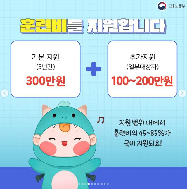 국민내일배움카드는 고용노동부에서 운영하는 직업능력개발 지원 제도로, 교육·훈련비를 지원하여 국민의 직무능력 향상을 돕는 제도입니다. 카드 발급 시 5년간 최대 300만 원의 훈련비를 지원받을 수 있으며, 특정 조건을 충족하면 추가로 200만 원까지도 지원받을 수 있습니다. 또한 장기 교육과정 참여 시 월 최대 20만 원의 훈련장려금도 지급됩니다.