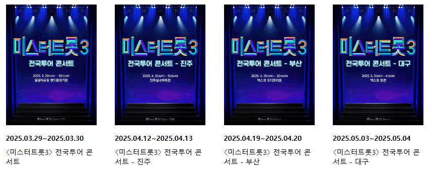 미스터트롯3 전국투어 콘서트 부산 공연 안내트로트 팬 여러분께 기쁜 소식을 전해드립니다! 2025년 4월 19일(토)부터 4월 20일(일)까지 부산 벡스코 오디토리움에서 〈미스터트롯3〉 전국투어 콘