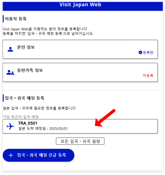 28) 등록이 완료됨을 확인하고 "입국, 귀국 수속으로 돌아가기"를 누릅니다.