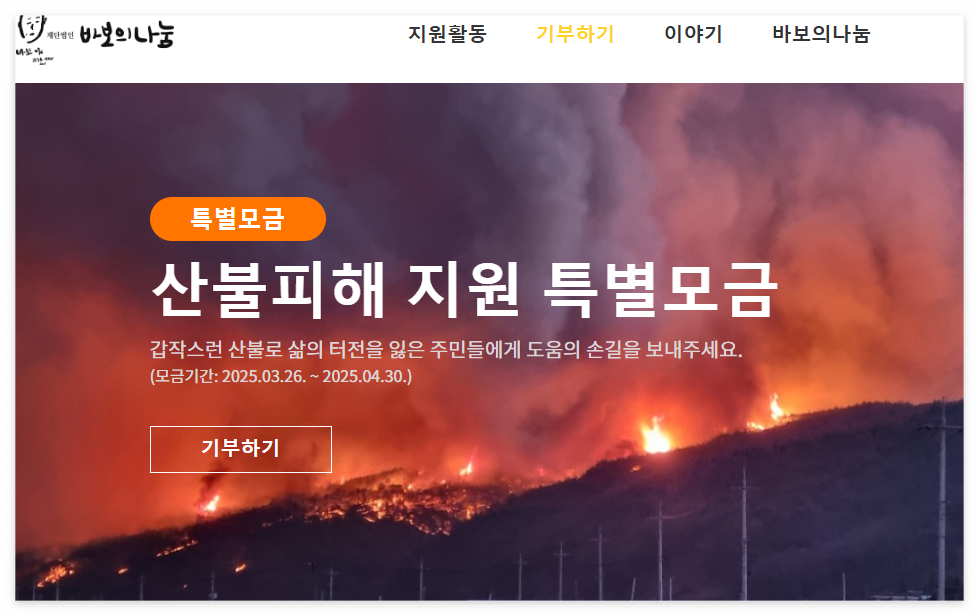 ▶ 홈페이지 기부: 바보의나눔 산불피해 지원 특별모금 페이지에 접속하여 '기부하기' 버튼을 클릭한 후 안내에 따라 기부를 진행합니다.