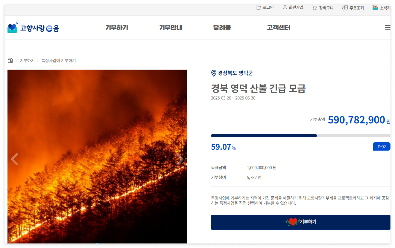 고향사랑e음 (영덕군) | 홈페이지 지정 기부 | 영덕군 산불 피해 복구 지원 |