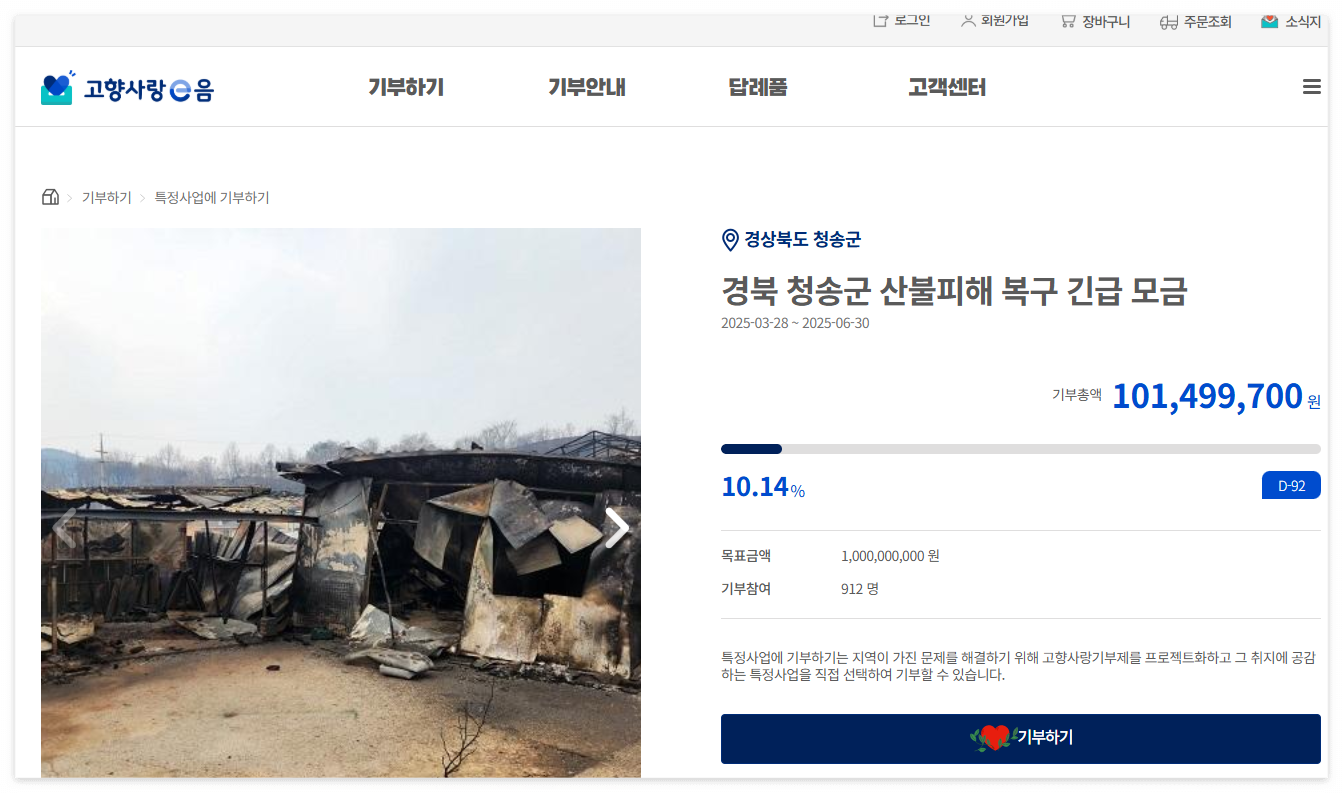 고향사랑e음 (청송군) | 홈페이지 지정 기부 | 청송군 산불 피해 복구 지원 |