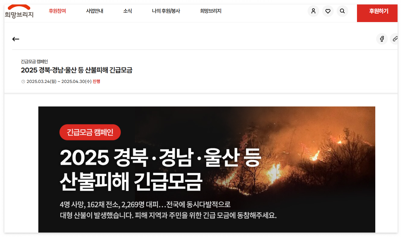 ▶ 홈페이지 기부: 희망브리지 홈페이지에 접속하여 '산불 피해 후원하기'를 선택한 후 안내에 따라 기부를 진행합니다.