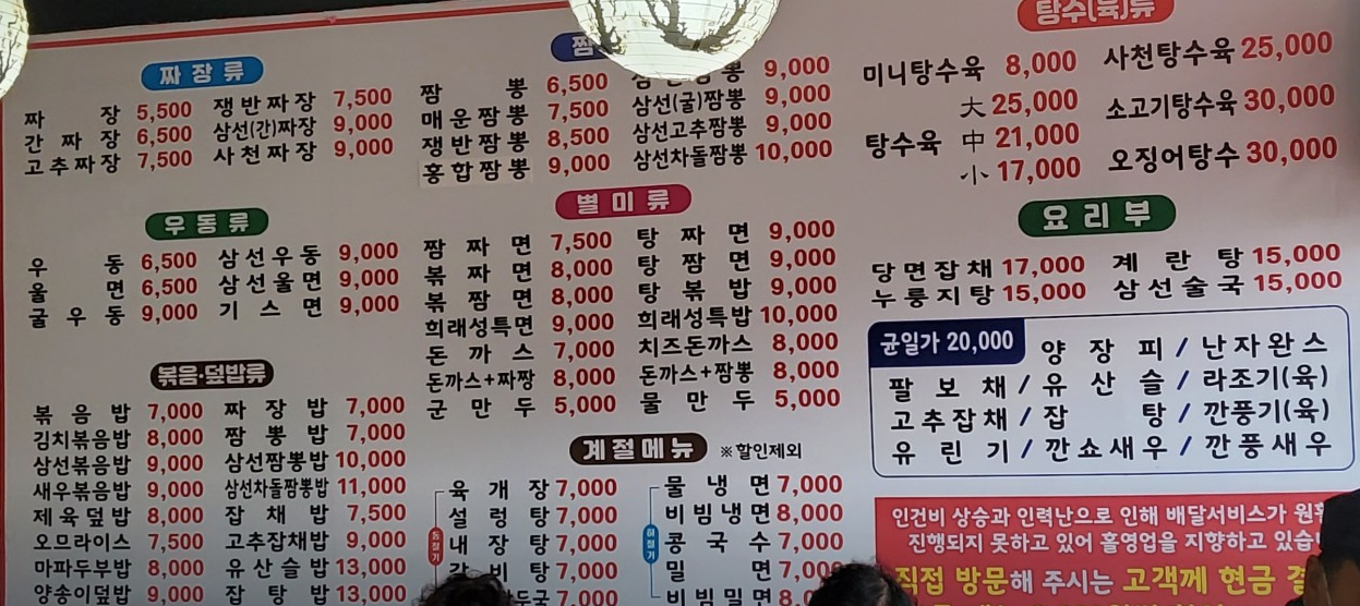 2. 희래성 메뉴 및 가격 정보