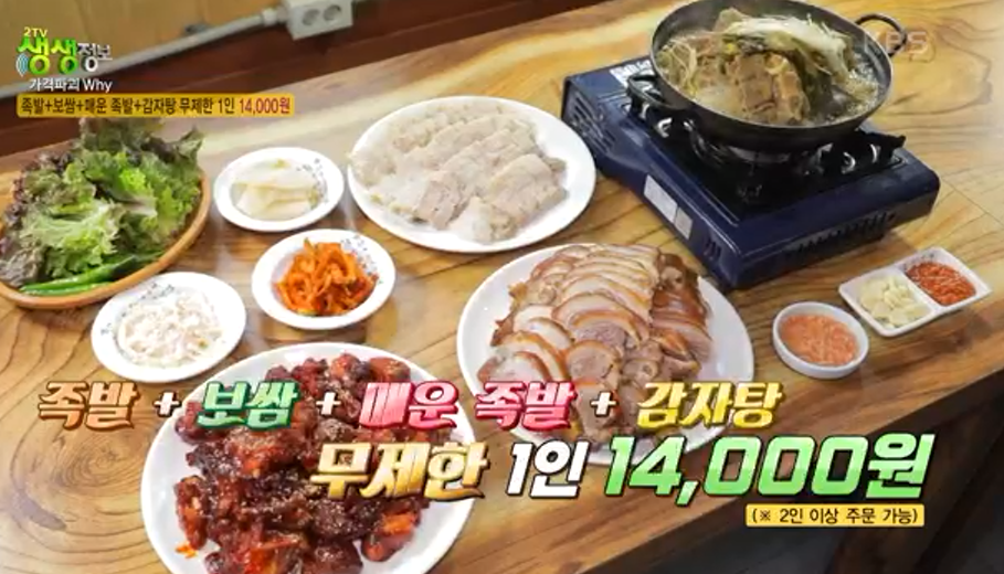 최고의 메뉴는 "족발 + 보쌈 + 매운족발 + 감자탕, 무제한 1인 14,000원 (2인이상 주문시)" 입니다.