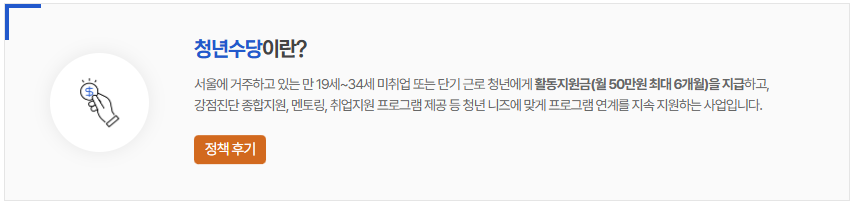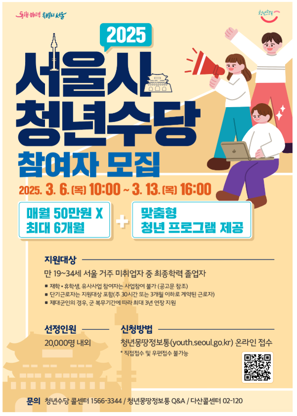 서울시 청년수당, 미취업 청년을 위한 희망의 디딤돌! 서울시는 미취업 청년들의 경제적 부담을 완화하고 안정적인 사회 진입을 돕기 위해 청년수당을 운영하고 있습니다. 이 프로그램은 청년들에게 월 50만 원씩 최대 6개월간 지원하며, 다양한 성장지원 프로그램을 통해 개인의 역량 강화와 취업 준비를 돕고 있습니다. 현재(3/14 기준) 신청은 마감이 되었지만, 아래 글을 통해 청년수당을 이해하고 예비 선정자 발표 확인 방법 등을 함께 알아보면 어떨까요?