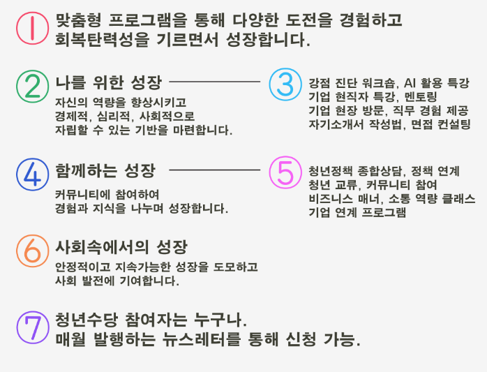 - 성장지원 프로그램: 멘토링, 특강, 정책정보 제공 등 청년의 필요에 맞는 다양한 프로그램 연계