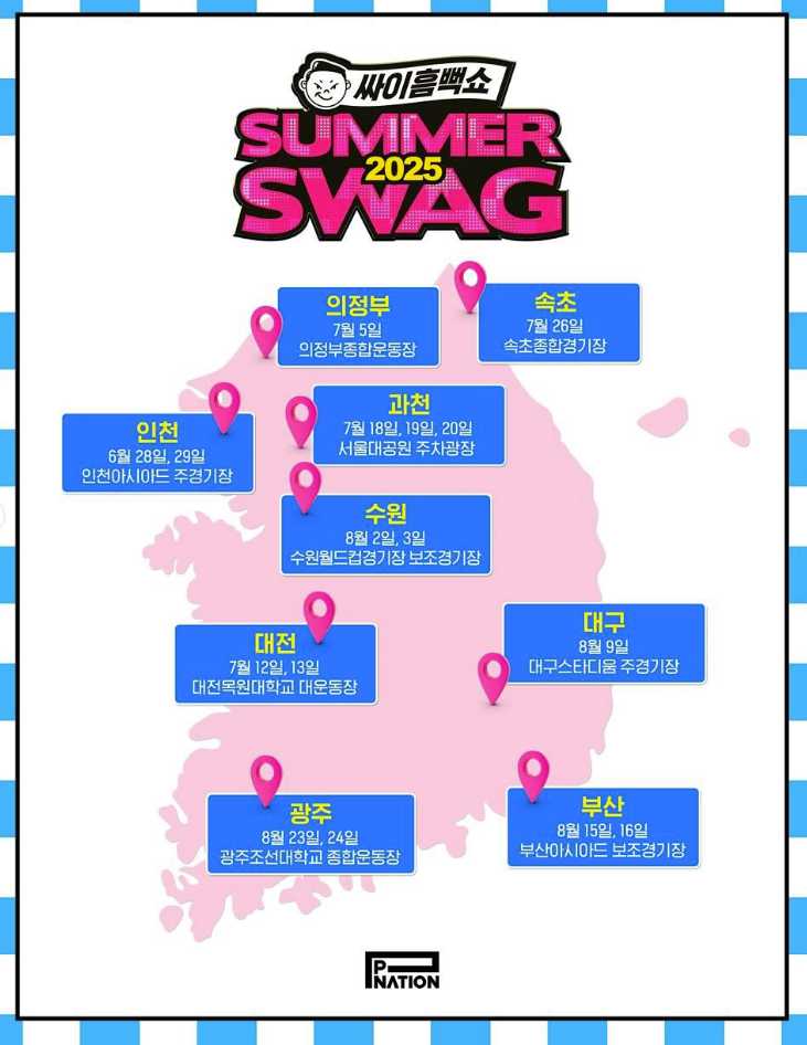 2025년 싸이 흠뻑쇼는 전국 9개 도시에서 진행되며, 인천에서 6월말 시작하여 8월까지 대부분 주말에 열릴 예정입니다. 공연 시작 시간은 저녁 6시(예정), 공연 시간은 약 2시간 30분 ~ 3시간 입니다. 일정은 아래표 참고해 주시고 좌석 배치도, 입장 밥업은 예매 페이지에서 확인하세요/