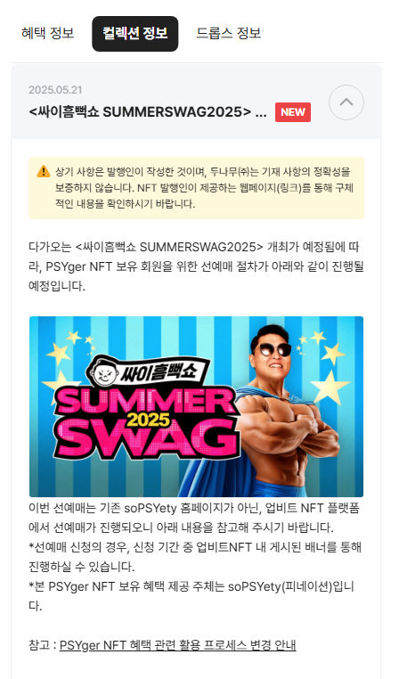 | 싸이 흠뻑쇼 2025 예매 방법, NFT PSYger 선예매란? (5) | 2025.05.24 |