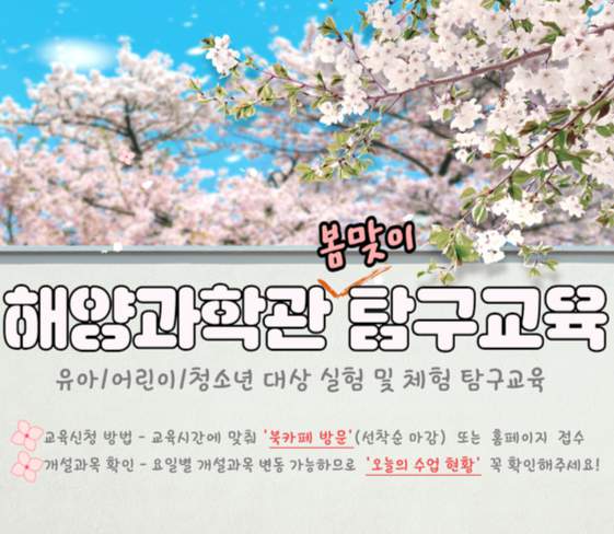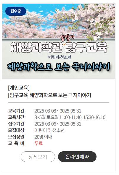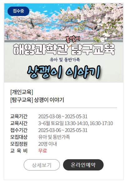 | 바다 탐험대 | 초등학생 이상 | 해양 생태계 탐사 체험 |