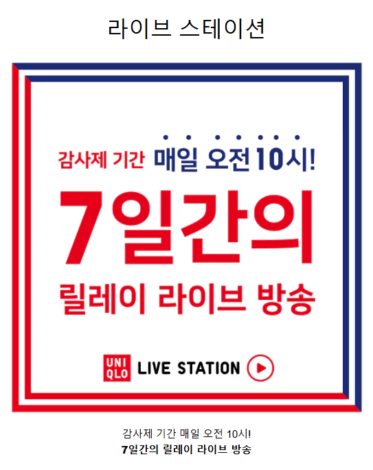감사제 기간 동안 매일 오전 10시에 유니클로 라이브 스테이션을 통해 다양한 제품 소개와 이벤트가 진행됩니다.