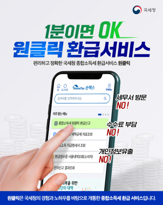 이제는 세금 환급도 시대에 맞게 간편하게, 신속하게 바뀌고 있습니다. 국세청의 ‘원클릭 환급’ 서비스는 세무 지식이 부족한 사람도 직접 환급 신청이 가능하도록 만들어졌으며, 수수료도 들지 않기 때문에 가장 경제적인 환급 방법입니다.