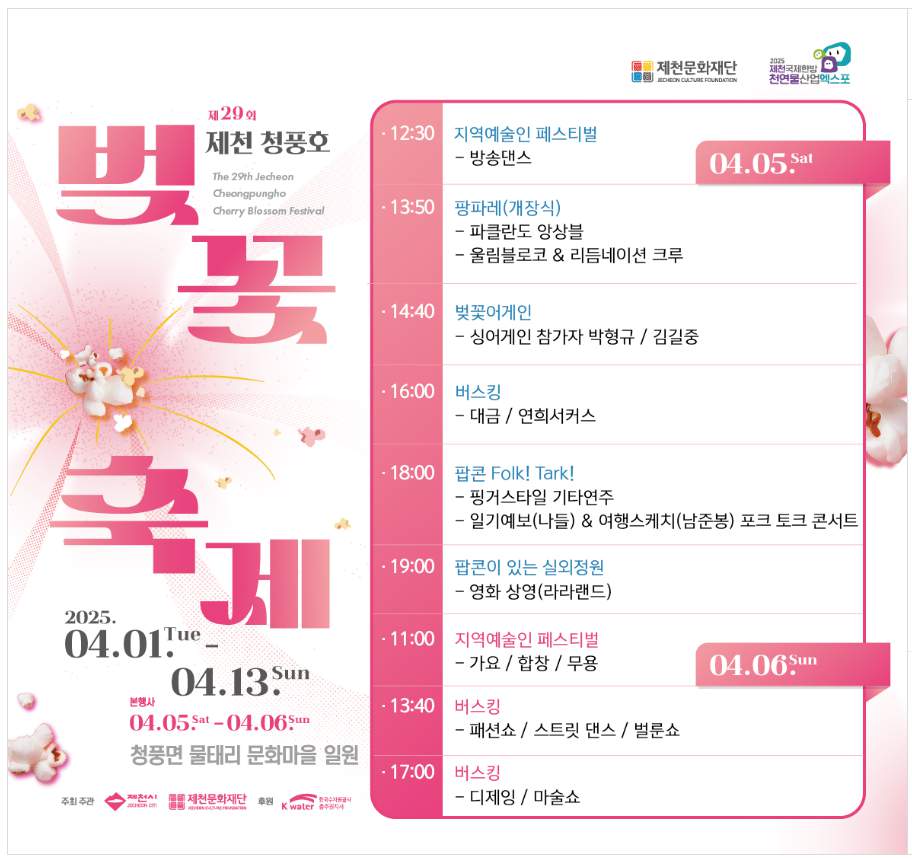 2025년 청풍호 벚꽃 축제 일정은 4월 1일부터 13일까지, 본행사는 4월 5일(토), 6일(일)에 진행됩니다.