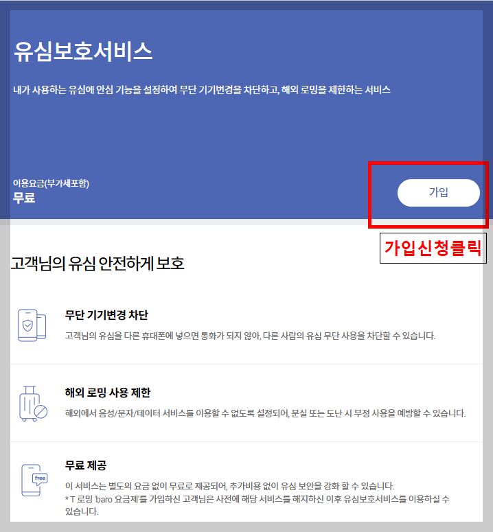 • 로밍 서비스와의 관계: '유심보호서비스'에 가입하면 해외 로밍 서비스를 이용할 수 없습니다. 따라서 로밍 서비스를 이용하려면 '유심보호서비스'를 해지해야 합니다.