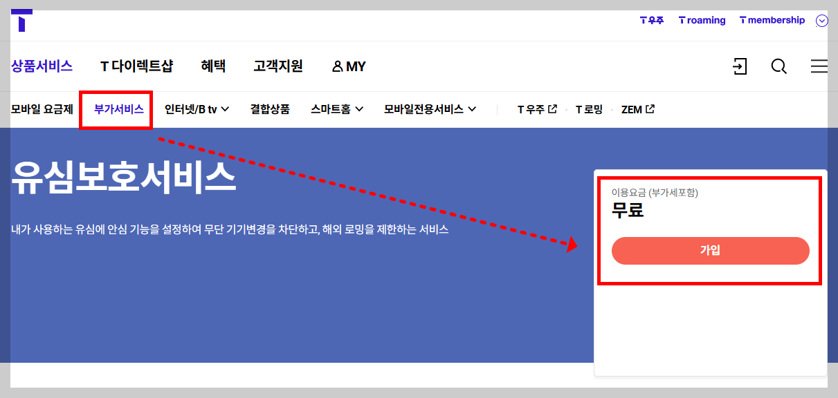 • '부가서비스' > '안심/보험' > '유심보호서비스' 메뉴를 선택합니다.